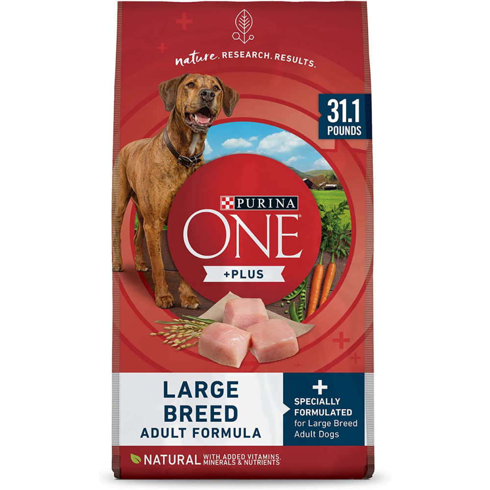 This large breed adult dog food is specifically made to meet the needs of your large pup. This food provides them with all of the necessary nutrition they need each day. Glucosamine and Chondroitin natural sources help to support joint health, while key omega-6 fatty acids and vitamin E help keep their skin healthy and your dog's coat shiny. This dog food contains high-quality protein that supports lean muscle mass no matter what size.