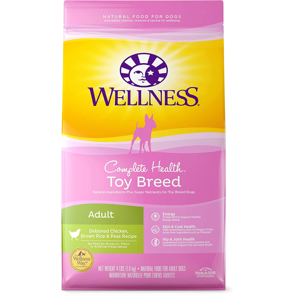 Wellness Toy Breed dog food must be your choice when you search for nutritionally dense, crunchy small kibbles for your canine. It contains chicken, brown rice, and peas that are healthy for the whole body.